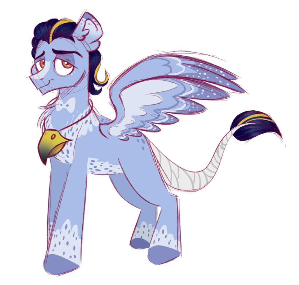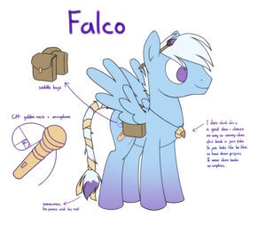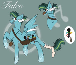 Falco is a male pegasus pony and was raised in a griffon family as the younger brother of Hop. He wraps his tail to look more griffon-like, and wears a necklace with a fake beak.