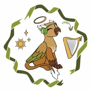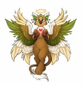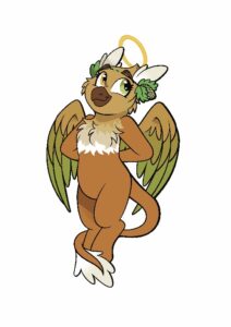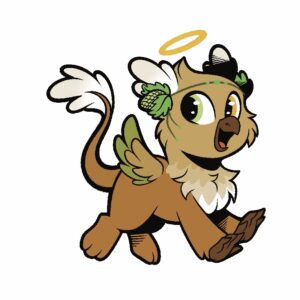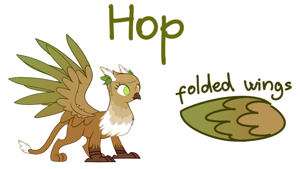 Hop is a female griffon with heterochromia (different eye colors) and wears some hop flowers on her head that go well with the white ear-like feathers.